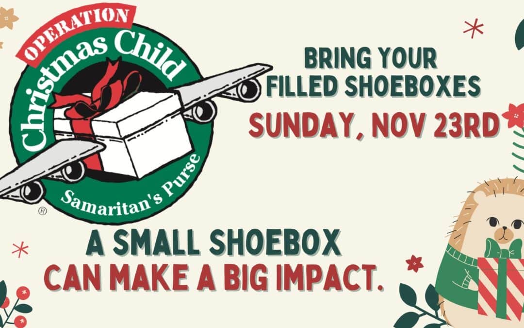 Bring your filled Shoeboxes at either the 9:00 am or 11:00 am service on Sunday, November 23rd.